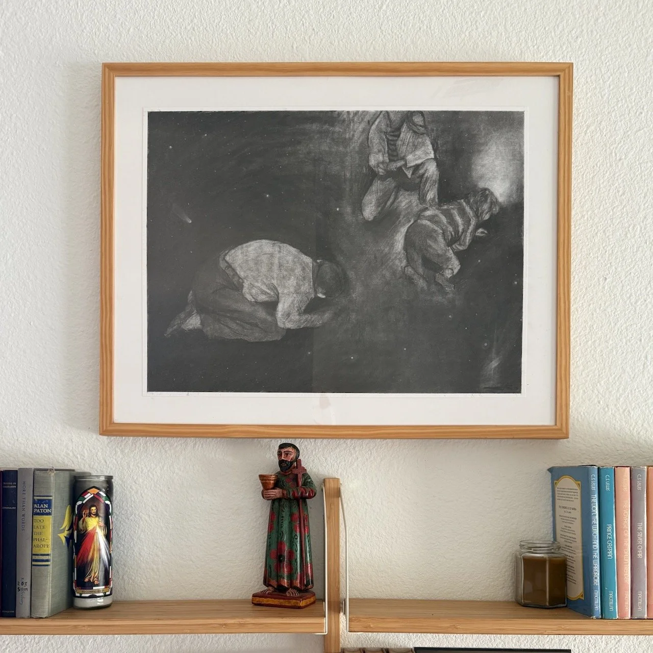 The poet Elizabeth Browning once wrote that “Earth’s crammed with heaven and every common bush afire with God.” I love the way Billy’s piece, Searching Heaven, captures this in its depiction of young children on the hunt for something in the common Earth and in doing so, transported to the cosmos. The use of charcoal and light makes it feel like they are in a world beyond this one, mining the night sky. It’s a reminder to me to heed Christ’s call to be like a child so as not to miss the heaven-crammed world, the God-saturated reality, all around us.